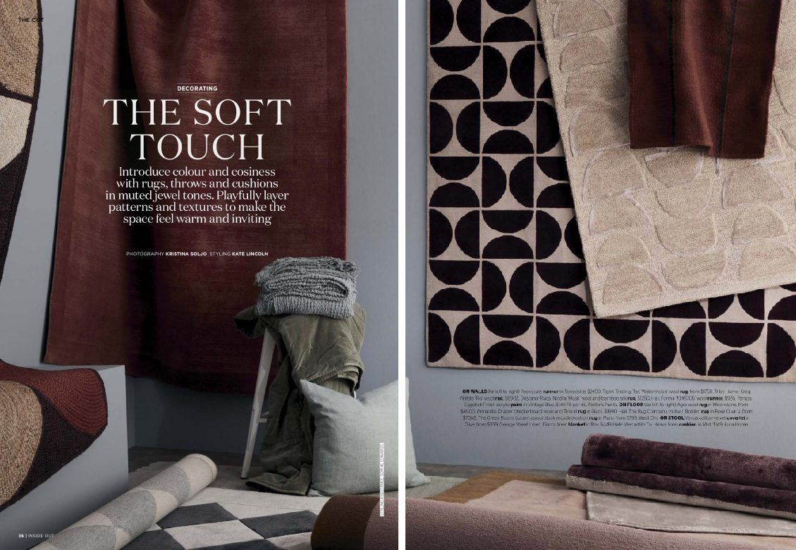 Inside Out May 2024 features Draper Black and Nigella Coconut, some of our handmade tufted rugs
